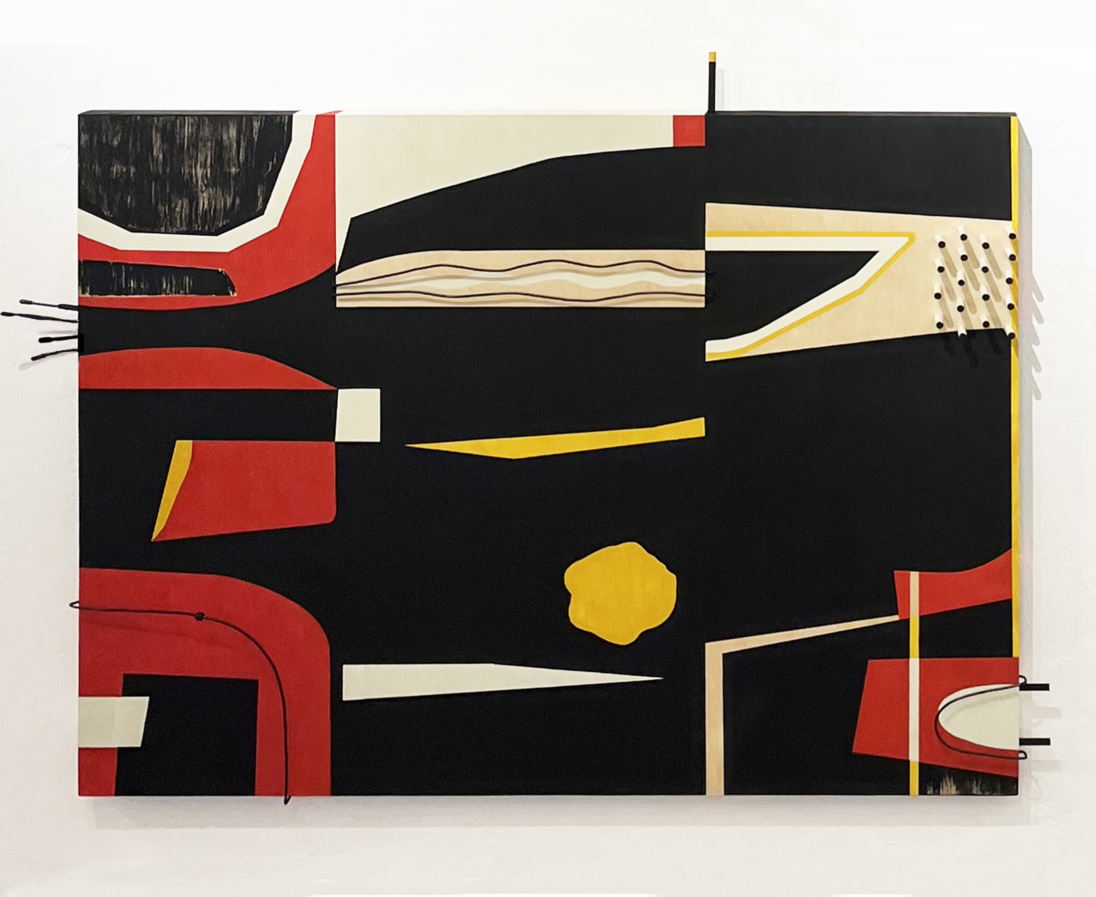 Mixed media: acrylic on birch panel with dimensional elements in wire.