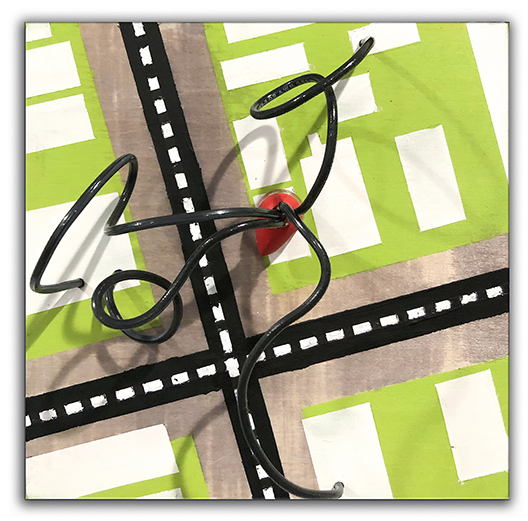 Mixed Media, Acrylic and florescent paint on a birch panel with dimensional elements in wire and plastic.
